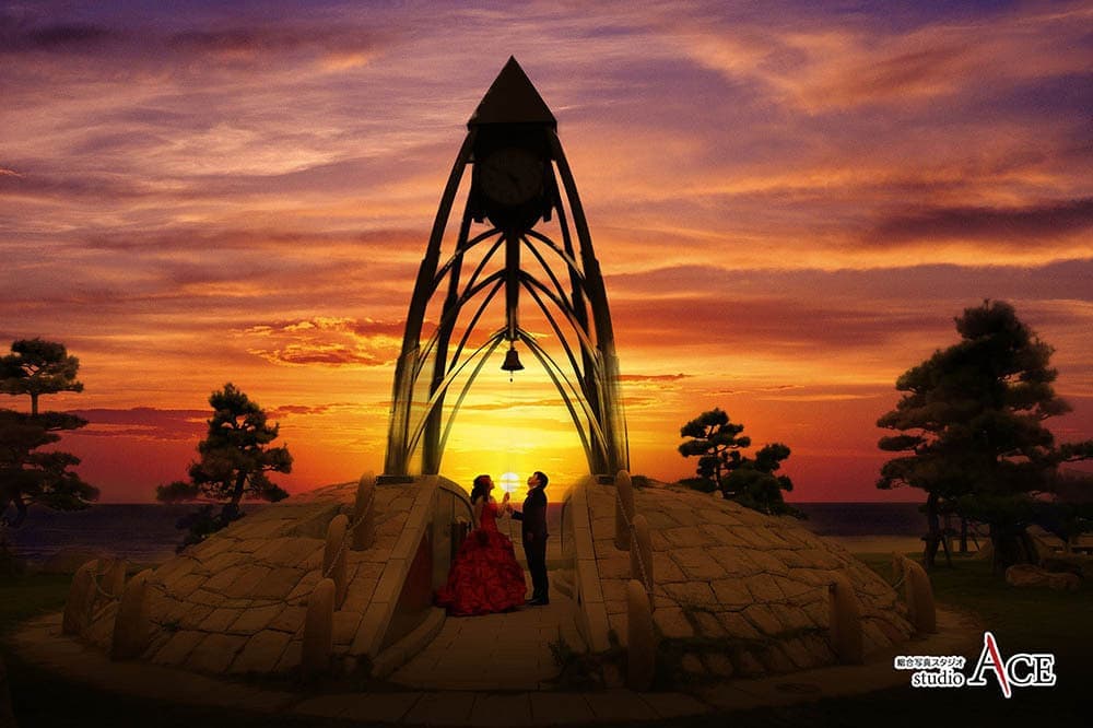 写真館スタジオエースから車で約1時間30分の観音寺市にある一の宮公園。広がる海と美しい砂浜を背景に、爽やかな風を感じながら前撮り撮影ができる人気のスポットです。特に朝や夕方には、柔らかな光と海の反射が幻想的な雰囲気を作り出し、ドレスや和装にもぴったり。穏やかな波の音を聞きながら、特別な瞬間を写真に収めるのもおすすめです。