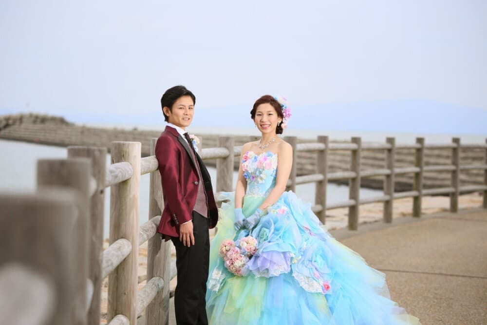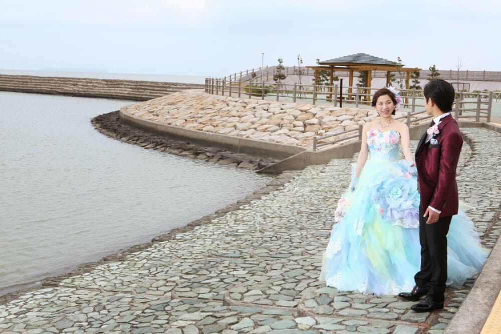 スタジオエースから車で約5分の所にある、マリンピア北緑地(公園)。海に面した綺麗に整備された遊歩道もあり、砂浜でなくても広大な海をバックに撮影が可能なフォトスポットです。前撮りでは人気のある車と一緒に撮影もマリンピア東岸壁から海をバック撮影が可能です。