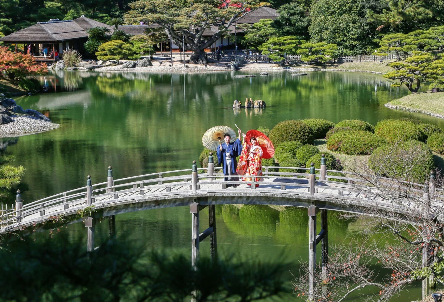 写真館スタジオエースから車で約1時間の高松市にある栗林公園。四季折々の美しい風景が広がる、人気の前撮り撮影スポットです。広大な池や古風な建物を背景に、優雅で落ち着いた一枚を残すのもおすすめ。特に春には桜、秋には紅葉が美しく、自然の美しさを感じながら撮影できます。歴史ある庭園で、特別な瞬間を写真に収めてみてはいかがでしょうか。