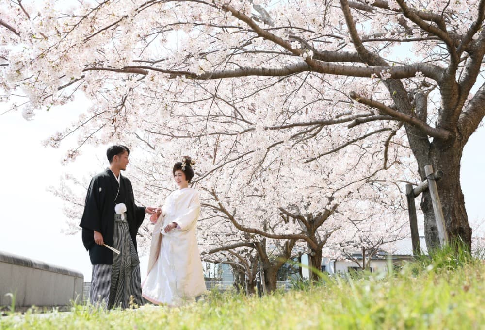 スタジオエースから車で3分、フォトウェディングにはもってこいのちょっとした桜並木です。遠くにロケは行きたくないけど、桜を背景に撮影したい、そんなお二人はここできまり!!