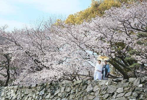 前撮りで人気の徳島城公園には,博物館前広場を中心に約250本のソメイヨシノがあり,多くの花見客で賑わいます。城跡の石垣に沿うようにも植えられており,桜と石積み,お堀が美しい姿を見せます。蜂須賀桜が咲き終える頃の3月下旬〜4月上旬には、徳島城のお堀端にたくさん植えられている桜の見事な姿が楽しめます。写真で桜と一緒に撮影するならココです。