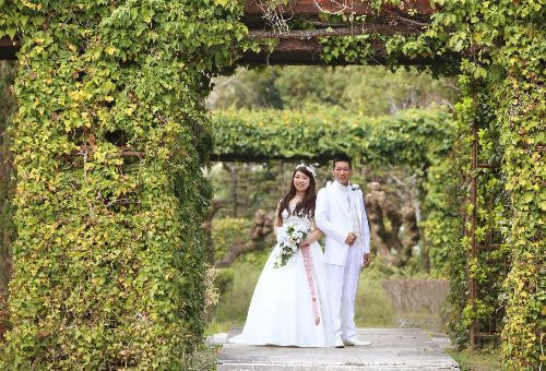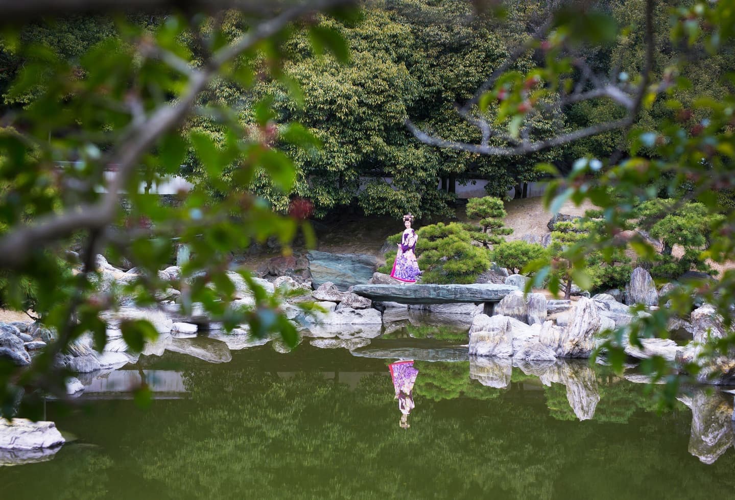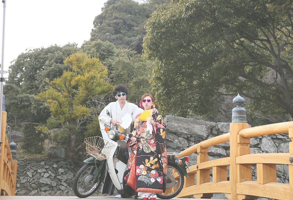 絶好の前撮りスポット徳島城公園のなかでも、入場料を払って撮影するのはなんて思うかもしれませんが、大人一人たったの¥50。白砂と石をメインに、水を使わず山水の景色を表現した枯山水や、大きな池にかかる石橋、中くぐり門など和の雰囲気にあった婚礼前撮りが体験できます。