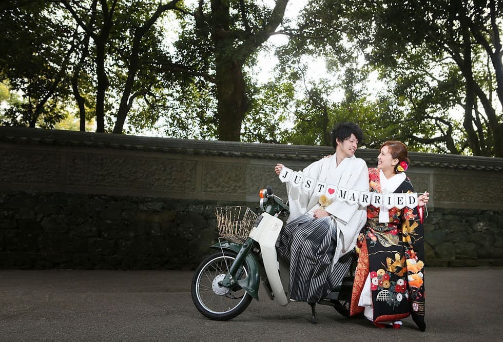 徳島城公園は、秋になると紅葉を迎え多数のイチョウの木が黄色に染まります。木々を彩る紅葉もすてきですが、散った後のイチョウの葉がみせる黄色の絨毯も風情があり、オススメです。自然が作った黄色をバックに和装でのフォトウェディング撮影をしてみませんか。